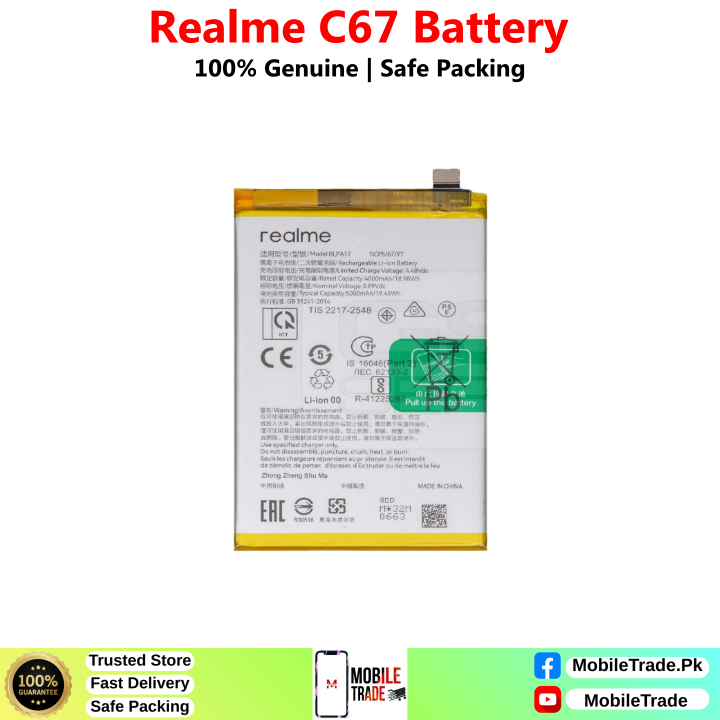 Want To Buy Realme C67 Original Battery In Pakistan? You’ve Came To The Right Place! MobileTrade.Pk Offers High Quality Mobile Phones Batteries at Cheapest Price. Buy a top-notch quality & 100% Original Batteries In Affordable Prices. There is a Bunch of Reasons why our Valuable Customers Keep Coming Back!